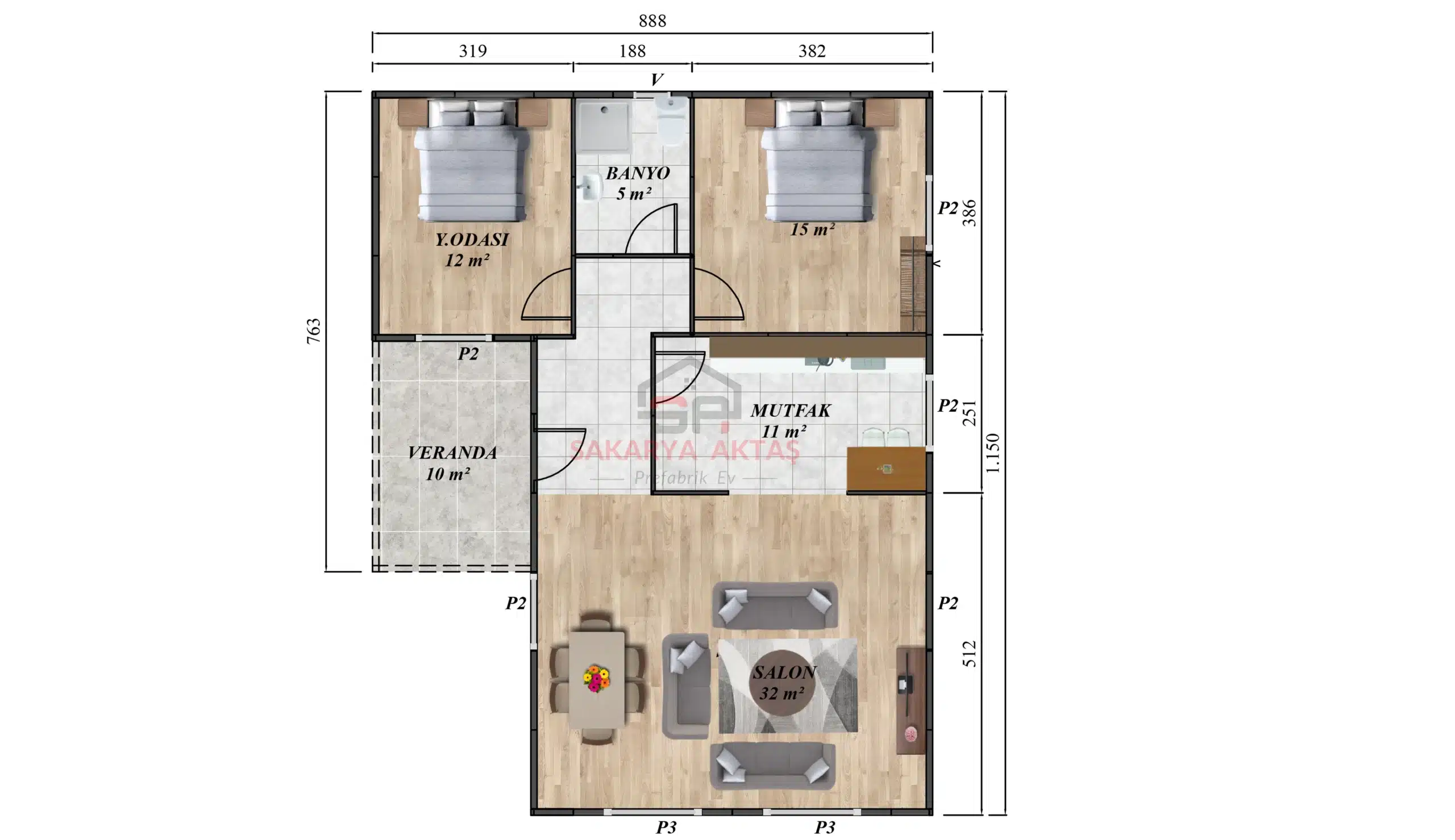 93 m² tek katlı prefabrik ev, geniş yaşam alanları ve estetik tasarımıyla her türlü ihtiyaca cevap verir. Dayanıklı malzemeler ile uzun yıllar güvenle kullanılabilir.
